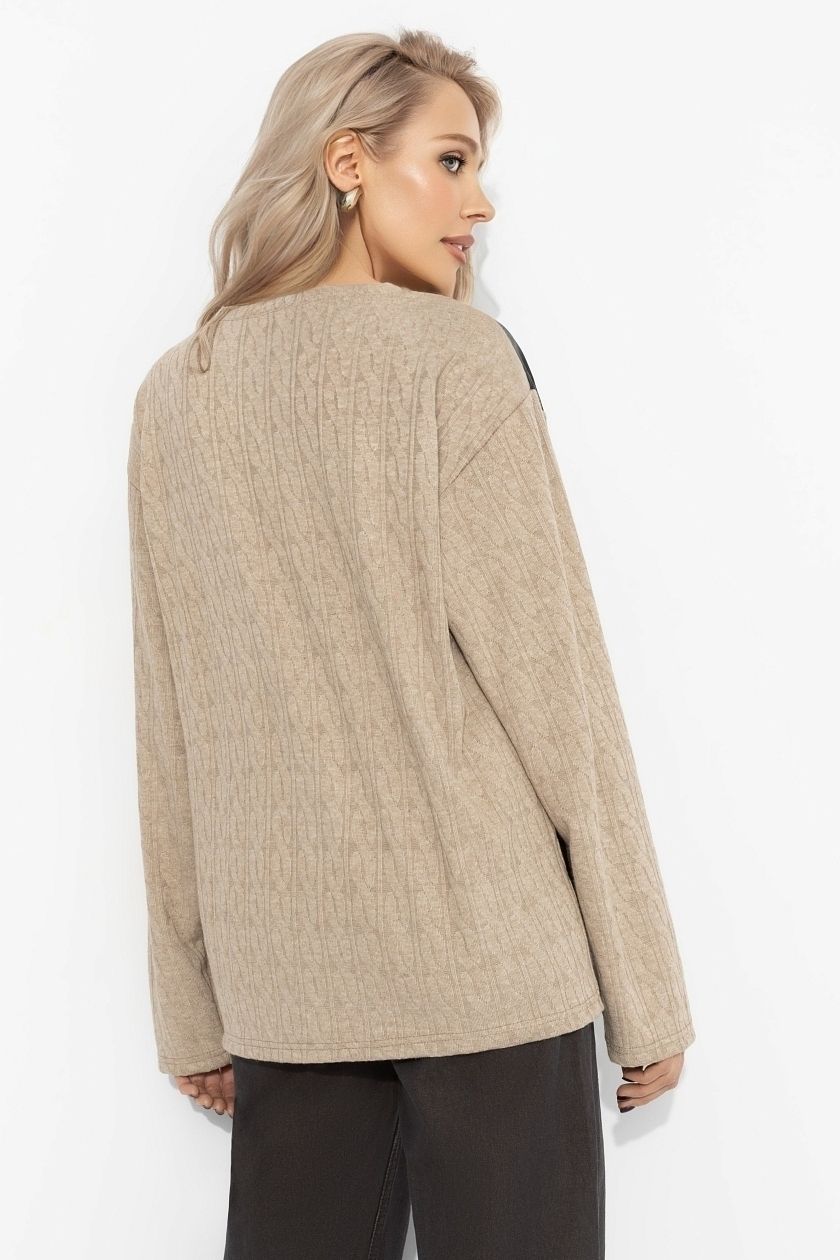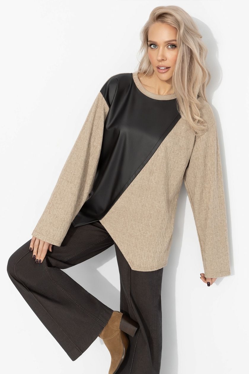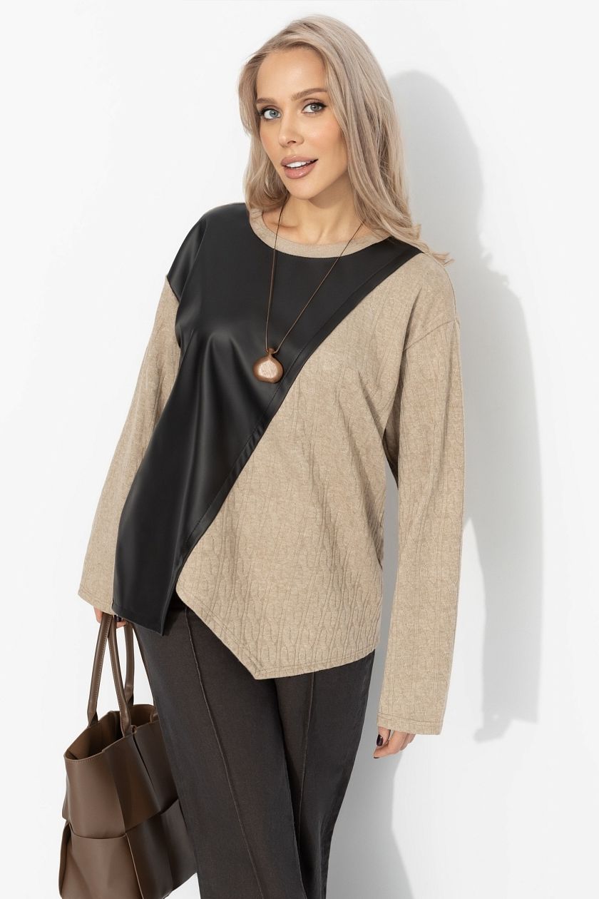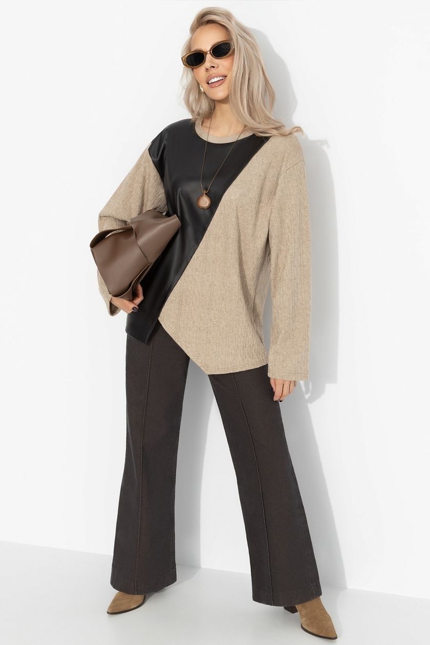 Лонгслив бежевый с асимметричным низом от компании Charutti. Лонгслив свободного кроя, выполнен из вязаного полотна и экокожи Круглый вырез горловины. Идеальный выбор для создания неповторимого образа.