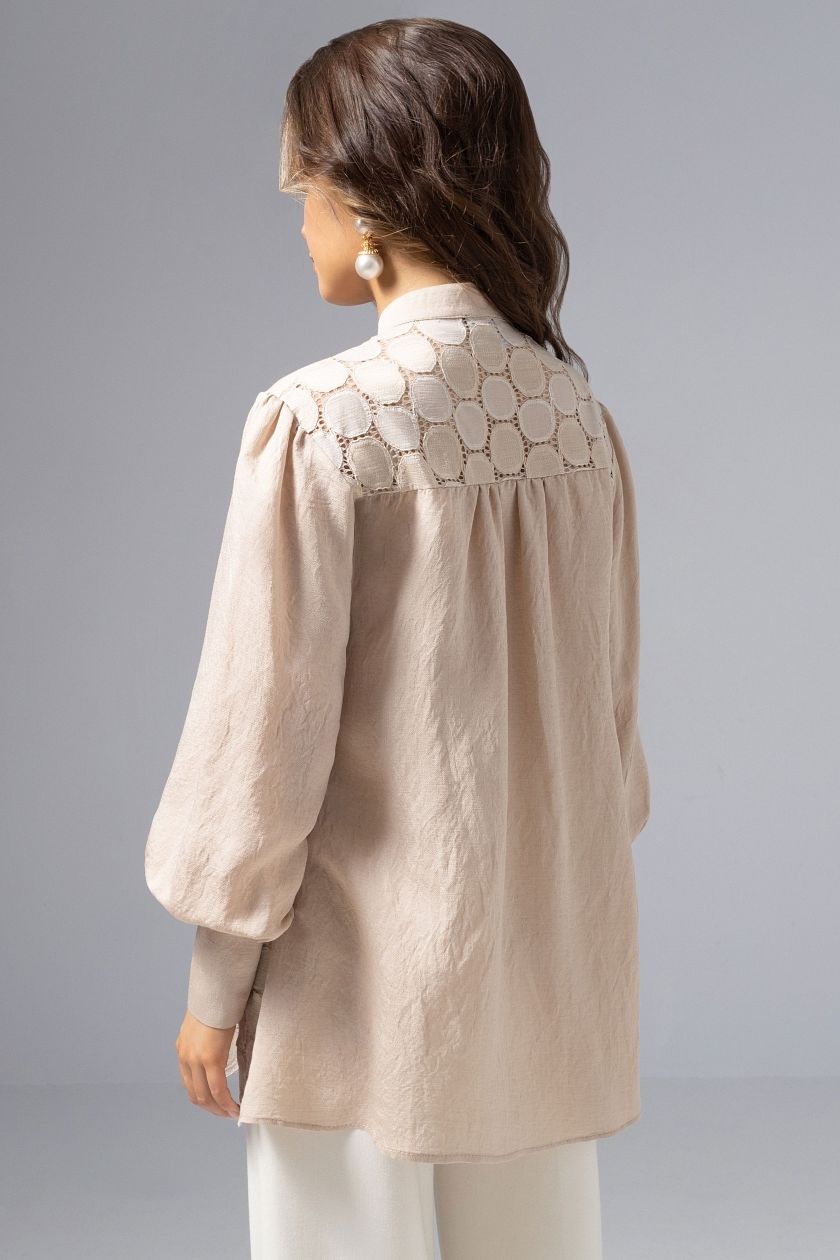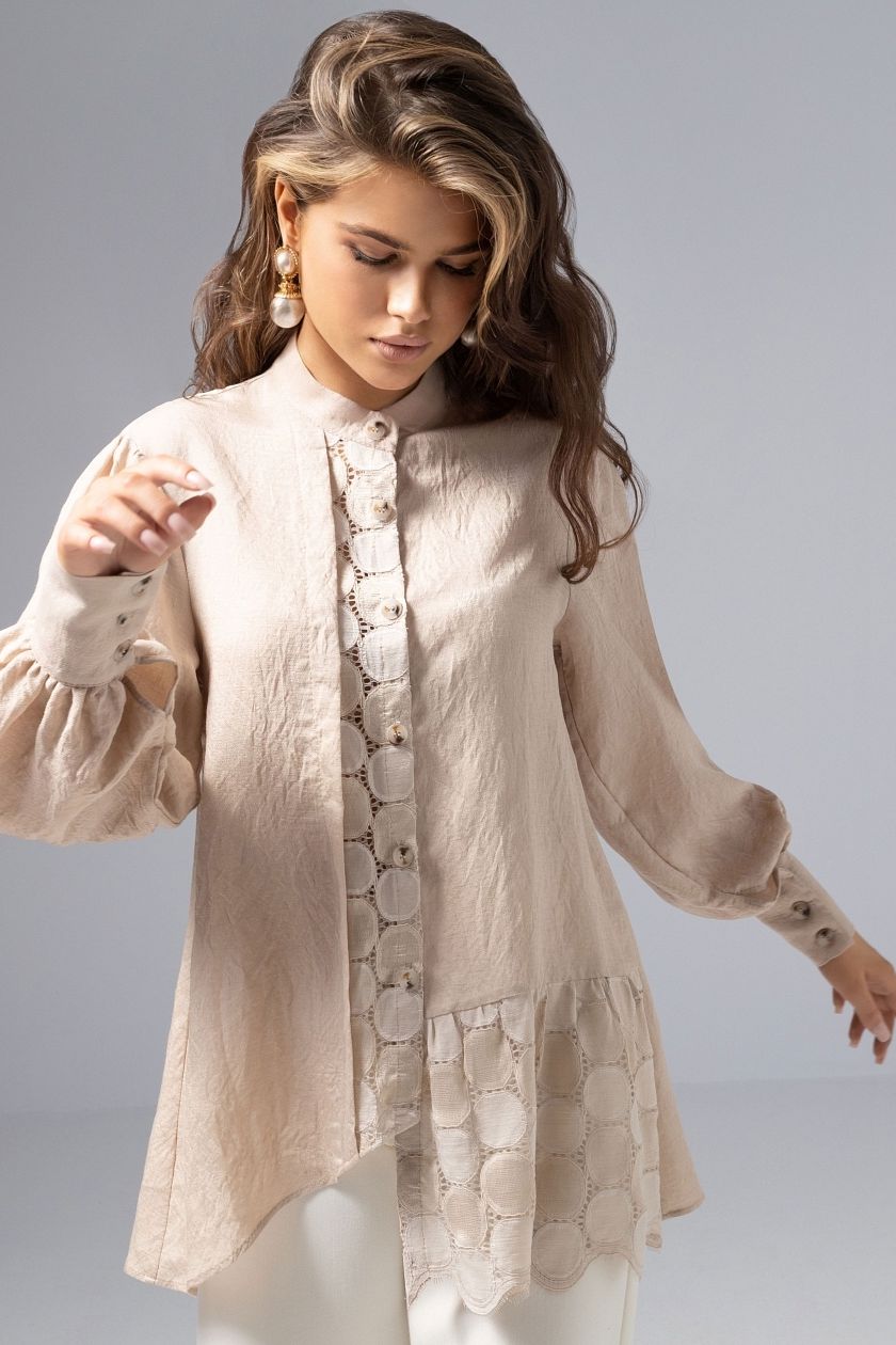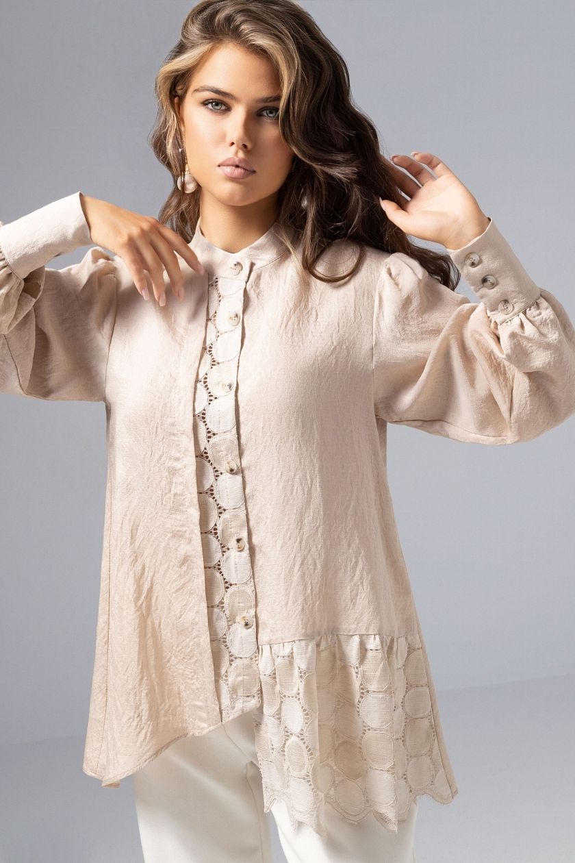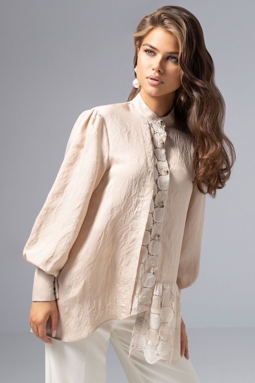 Рубашка бежевая комбинированная с кружевом от компании Charutti. Модель свободного силуэта, выполнена из блузочной ткани «фаби» и кружево. Сложный крой с воротником-стойкой и асимметричными рельефами подчеркивает архитектурность силуэта. Центральная застёжка на пуговицы. Длинные рукава. Идеальный выбор для создания неповторимого образа.