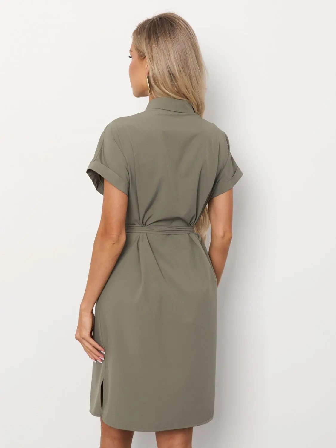 Платье-рубашка с поясом от компании Jetty. Модель прямого силуэта, выполнена из плательного полотна в цвете хаки. Воротник рубашечного типа. Короткий цельнокроеный рукав дополнен отворотом. В боковых швах разрезы.еальный выбор на каждый день.