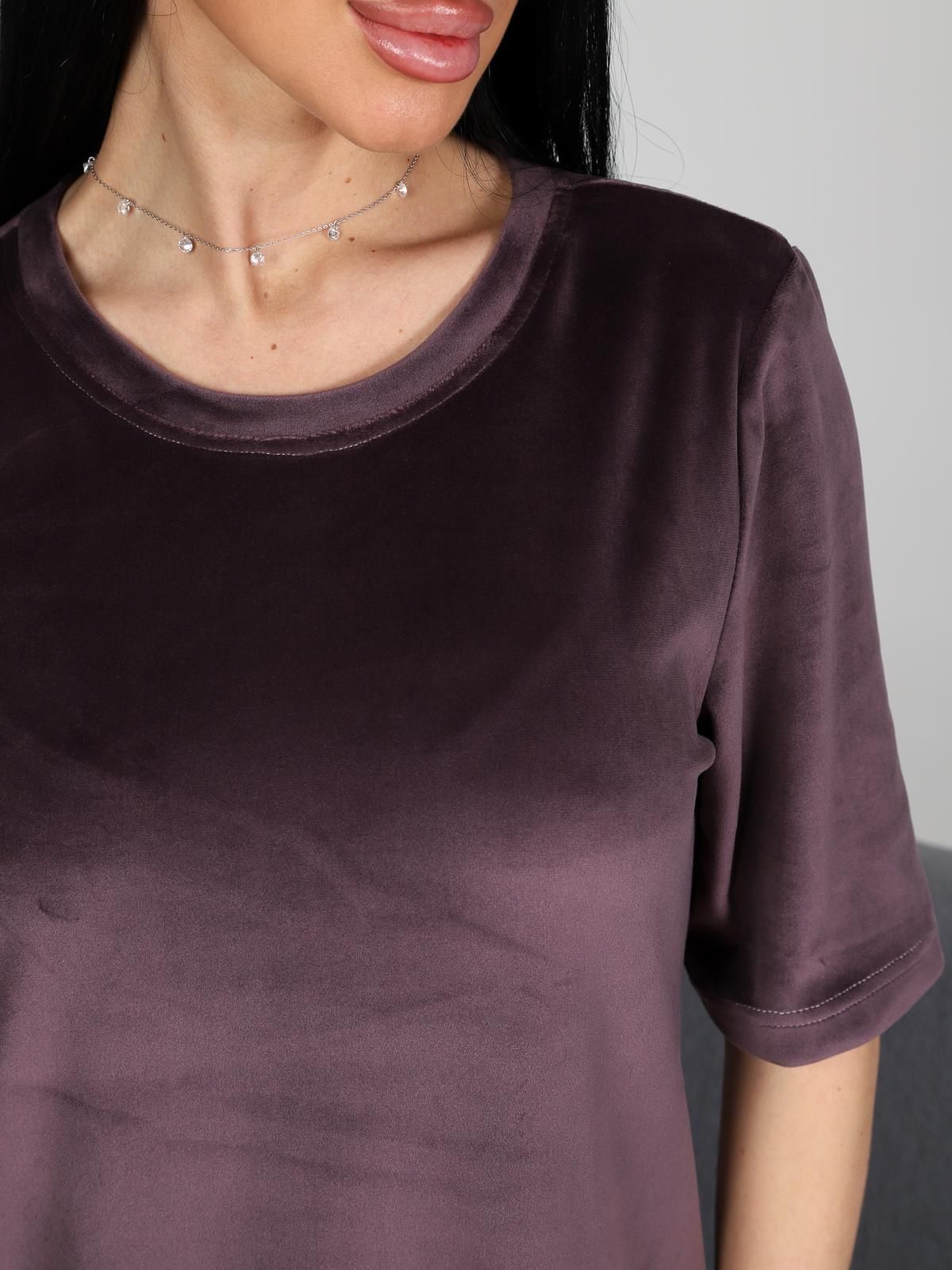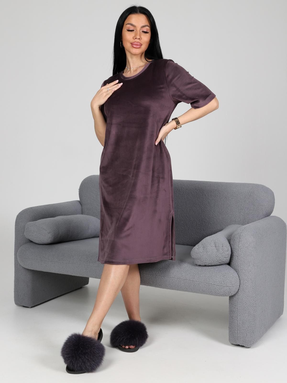 Платье домашнее из велюра от бренда IV-Capriz. Модель полуприлегающего кроя, круглый вырез горловины. Короткие рукава. Низ ровный, по бокам небольшие разрезы. Идеальный выбор для домашних модниц.