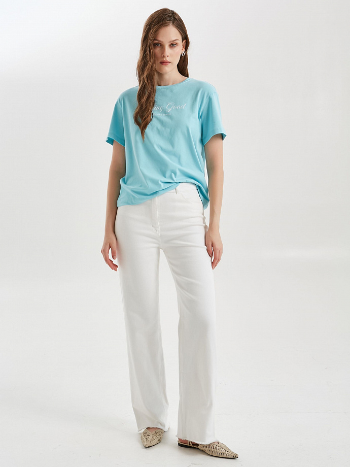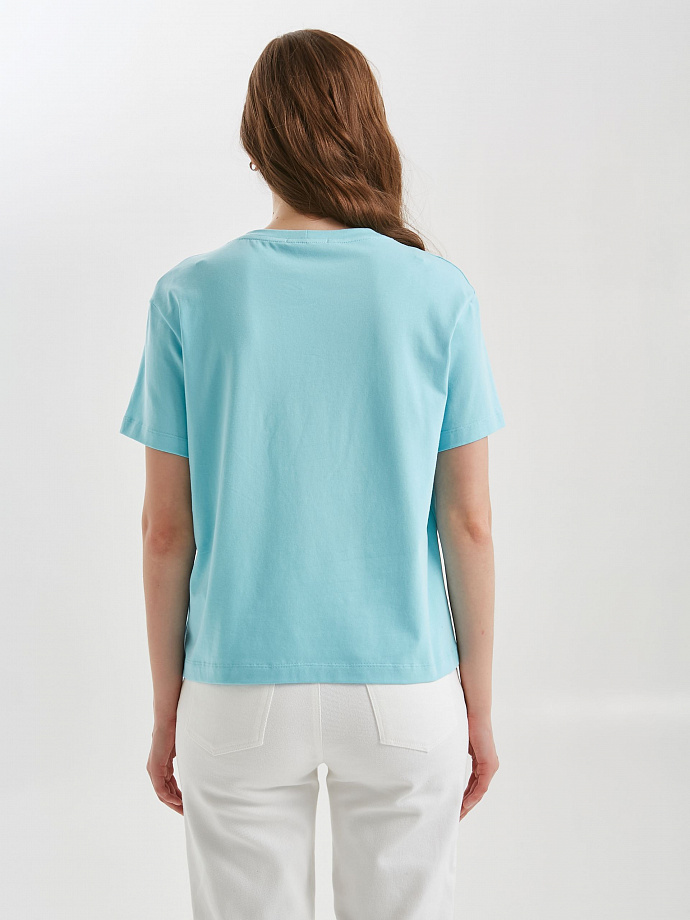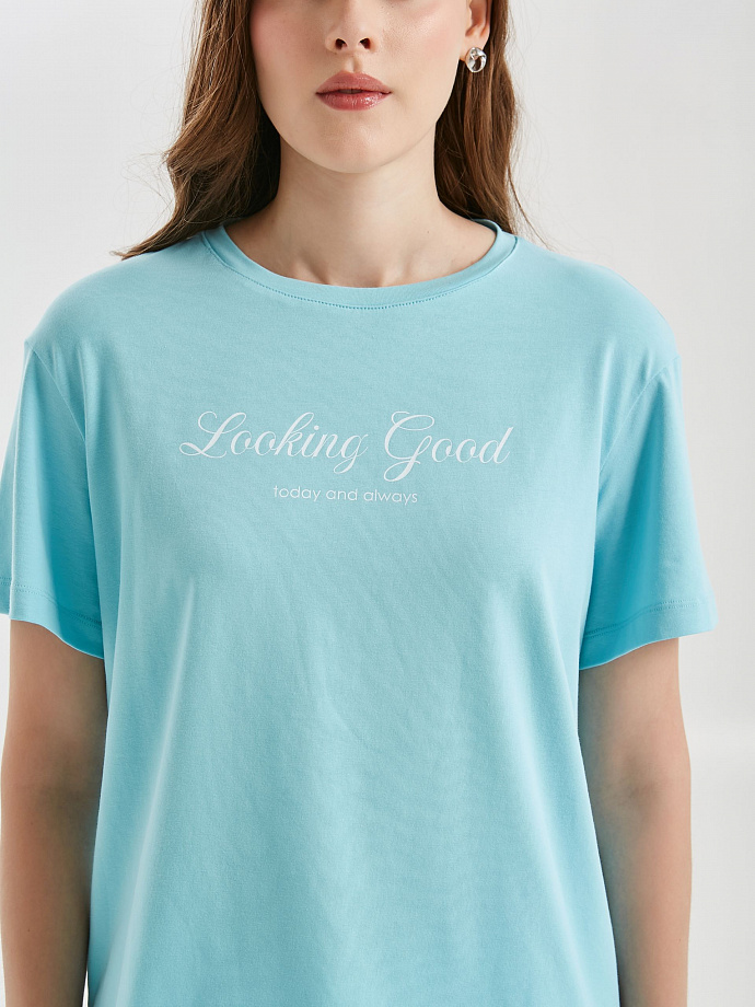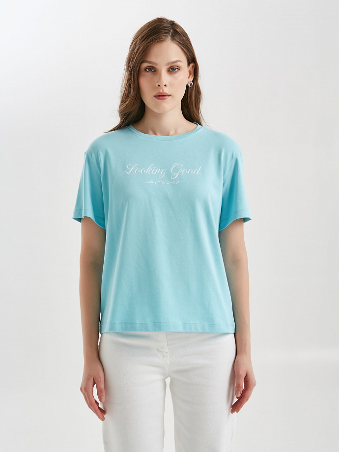 Футболка голубая с принтом от фабрики Priz. Модель прямого кроя, выполнена из трикотажа. Рукав втачной, короткий. Плечо спущенное. Горловина обработана бейкой. Комфорт и стиль на каждый день.