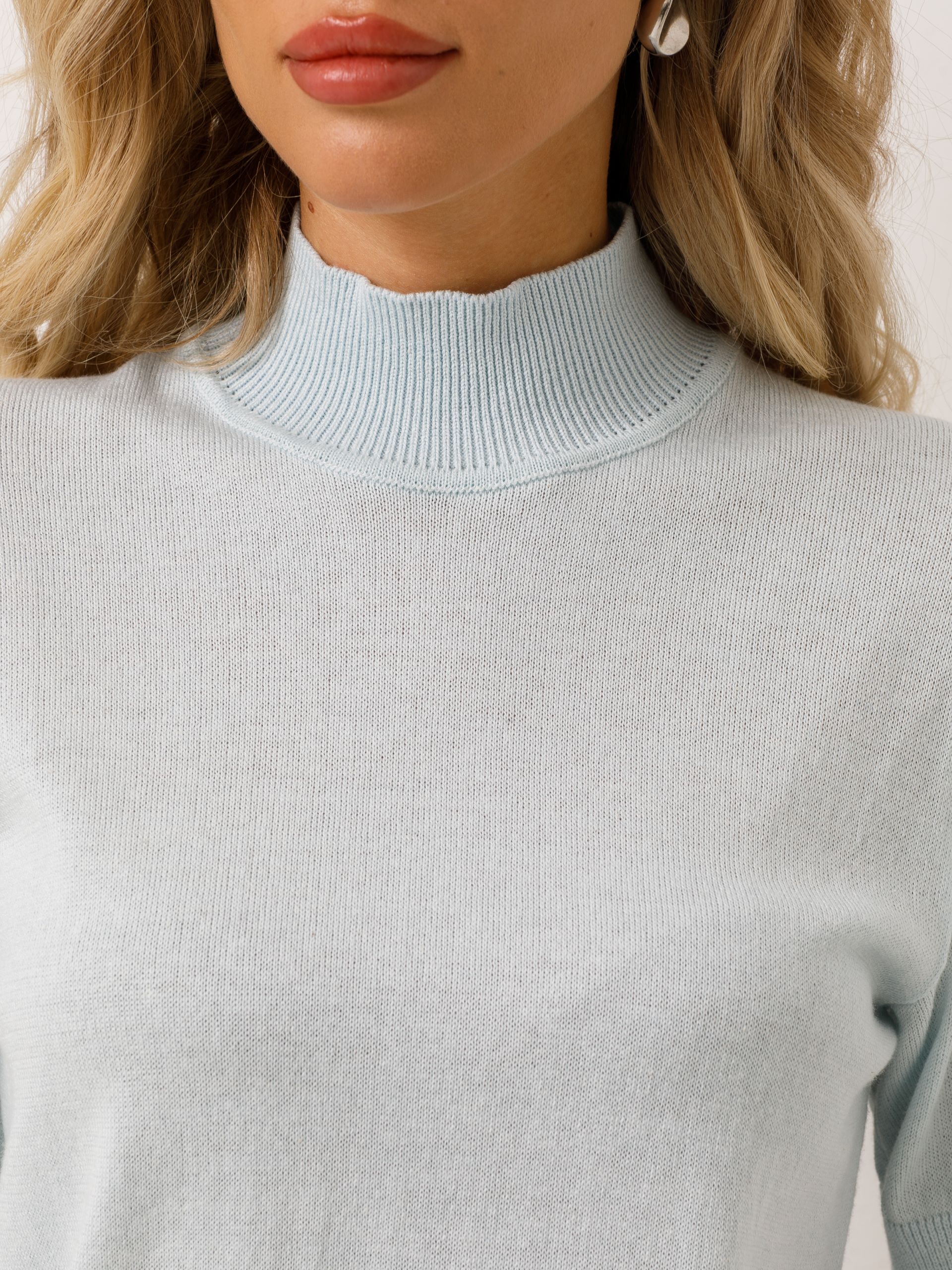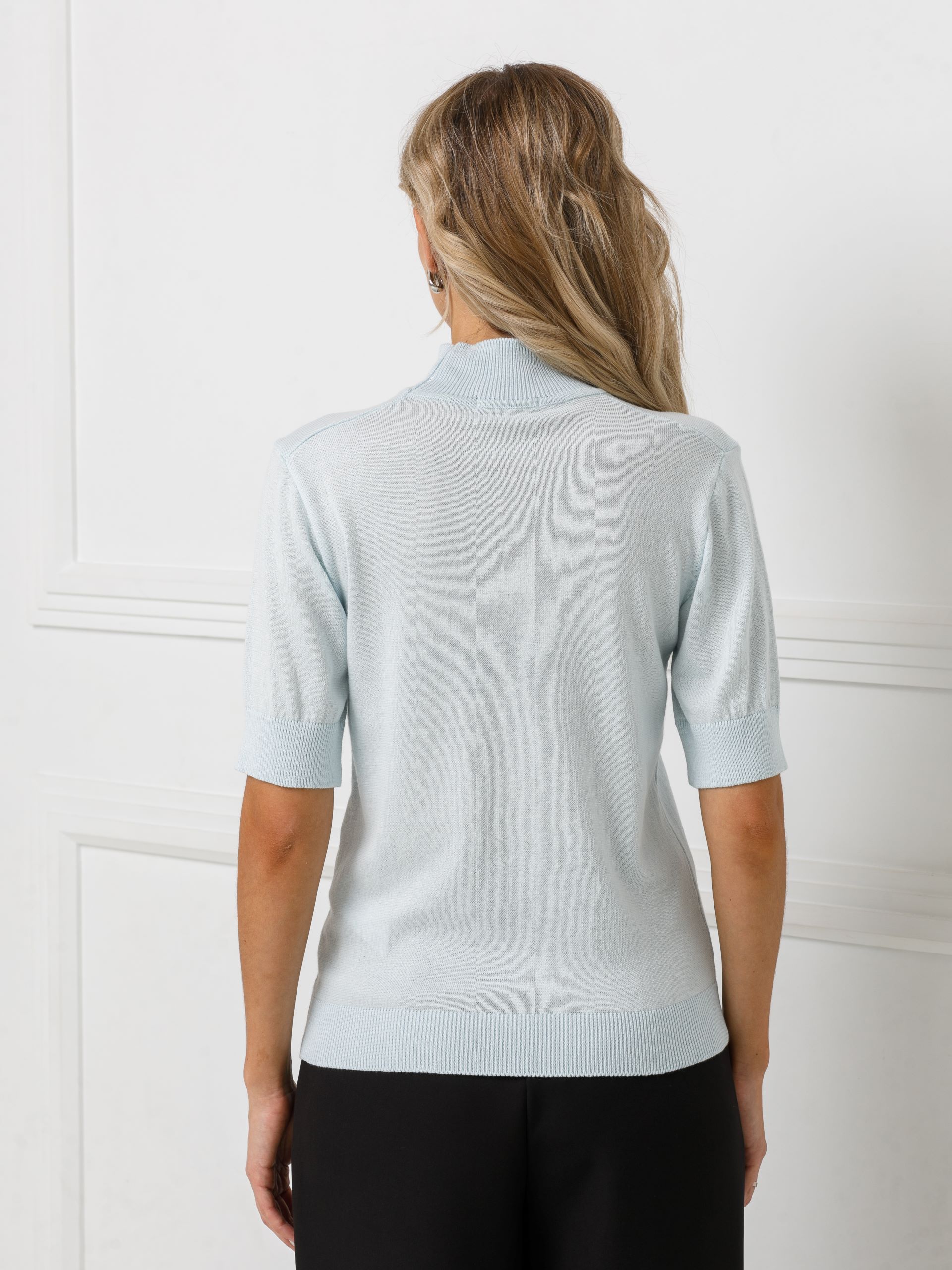 Водолазка голубая с коротким рукавом от фабрики Priz. Модель прямого силуэта, воротник-стойка. Рукав втачной. Низ ровный, без разрезов. Комфорт и стиль на каждый день.
