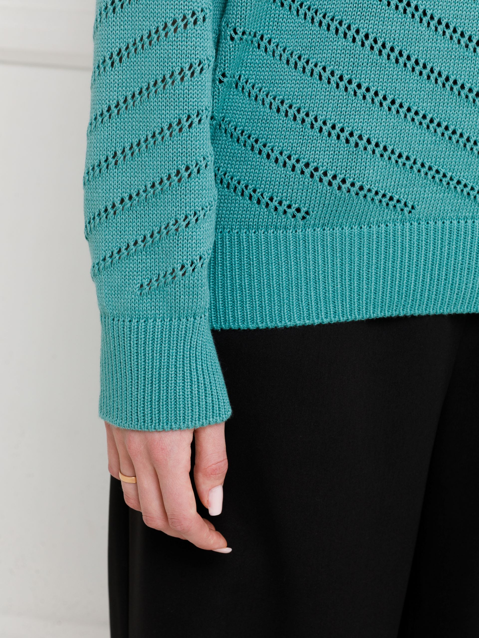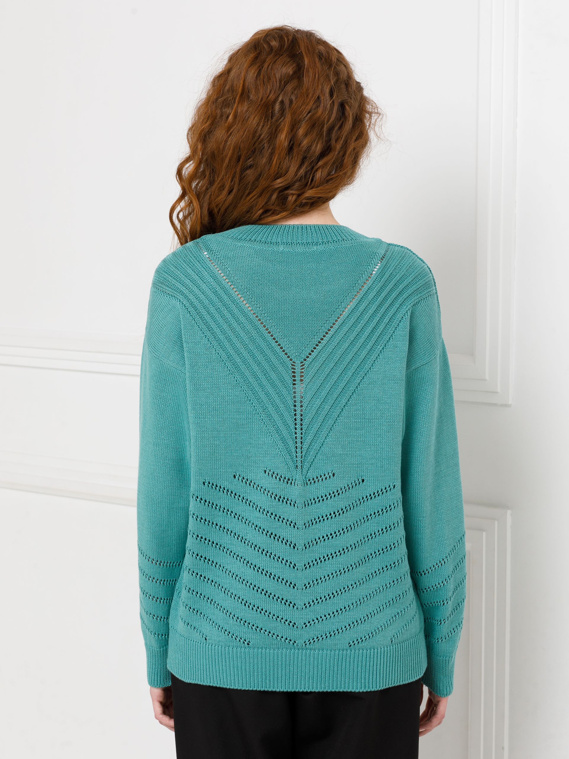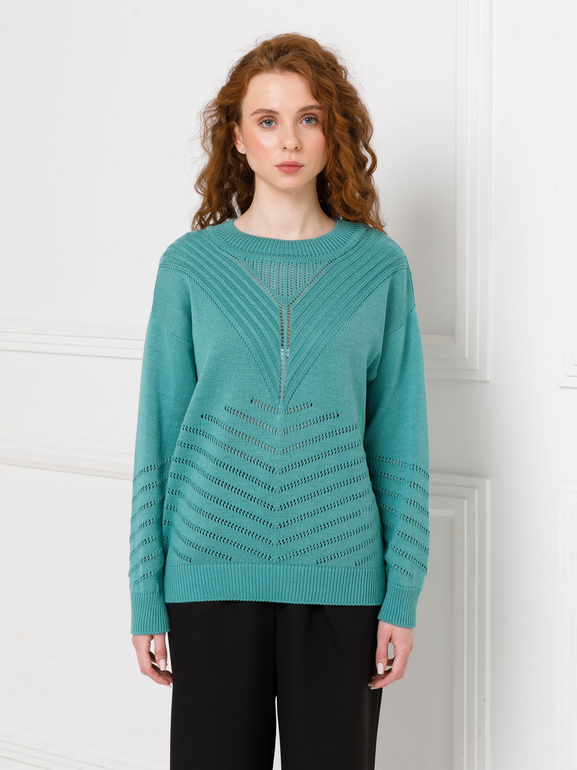 Джемпер вязаный с длинными рукавами в цвете морская пена от фабрики Priz. Модель прямого силуэта, круглый вырез горловины. Комфорт и стиль на каждый день.