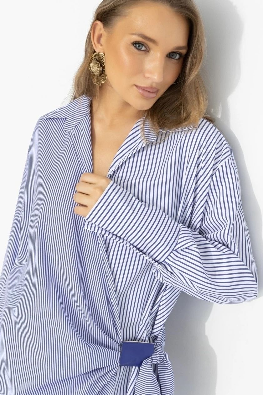 Рубашка в полоску на запах от компании Charutti. Модель прямого удлиненного кроя с запахом и завязкой на боковой узел корректирует линию талии и маскирует зону живота. Спущенное плечо и длинный рукав с широкими манжетами создают расслабленный силуэт. Классно сочетать с джинсами, леггинсами и кожаными брюками.