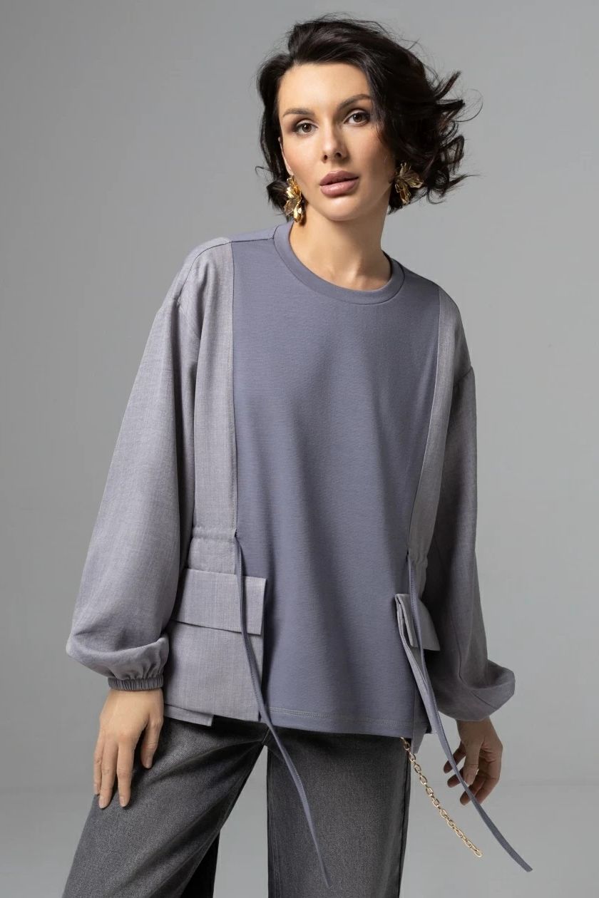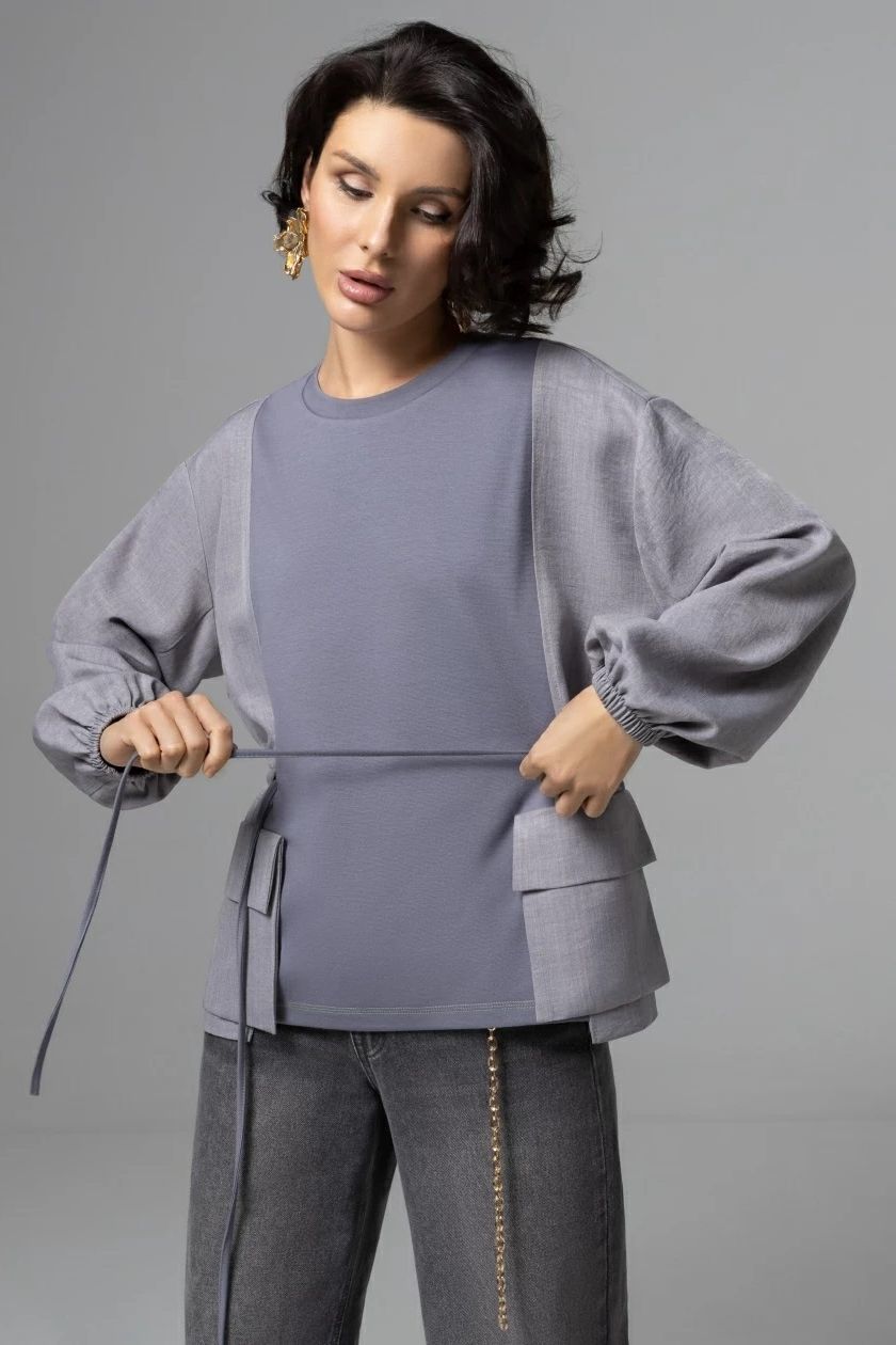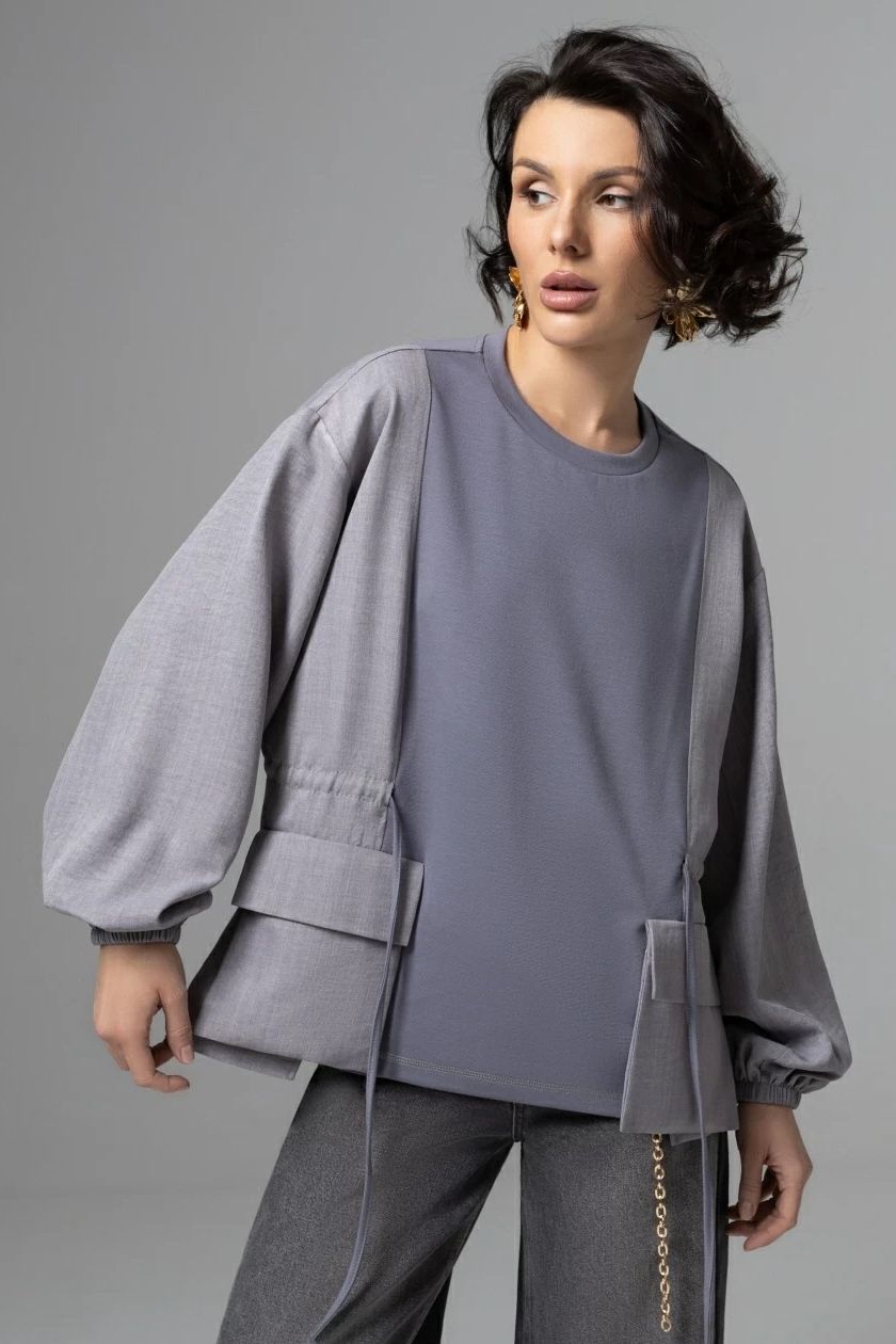 Свитшот комбинированный серый от компании Charutti. Модель прямого силуэта, выполнена из трикотажа и плательной ткани. Круглый вырез горловины. Втачные длинные рукава на резинке. Объемный рукав и завязки по бокам создают лёгкий намек на подиумный крой, но без перегруза – в этом свитшоте вы можете и вести переговоры, и улетать на выходные гулять у моря. Изделие с объёмными карманами, талия регулируется. Идеальный выбор на каждый день.