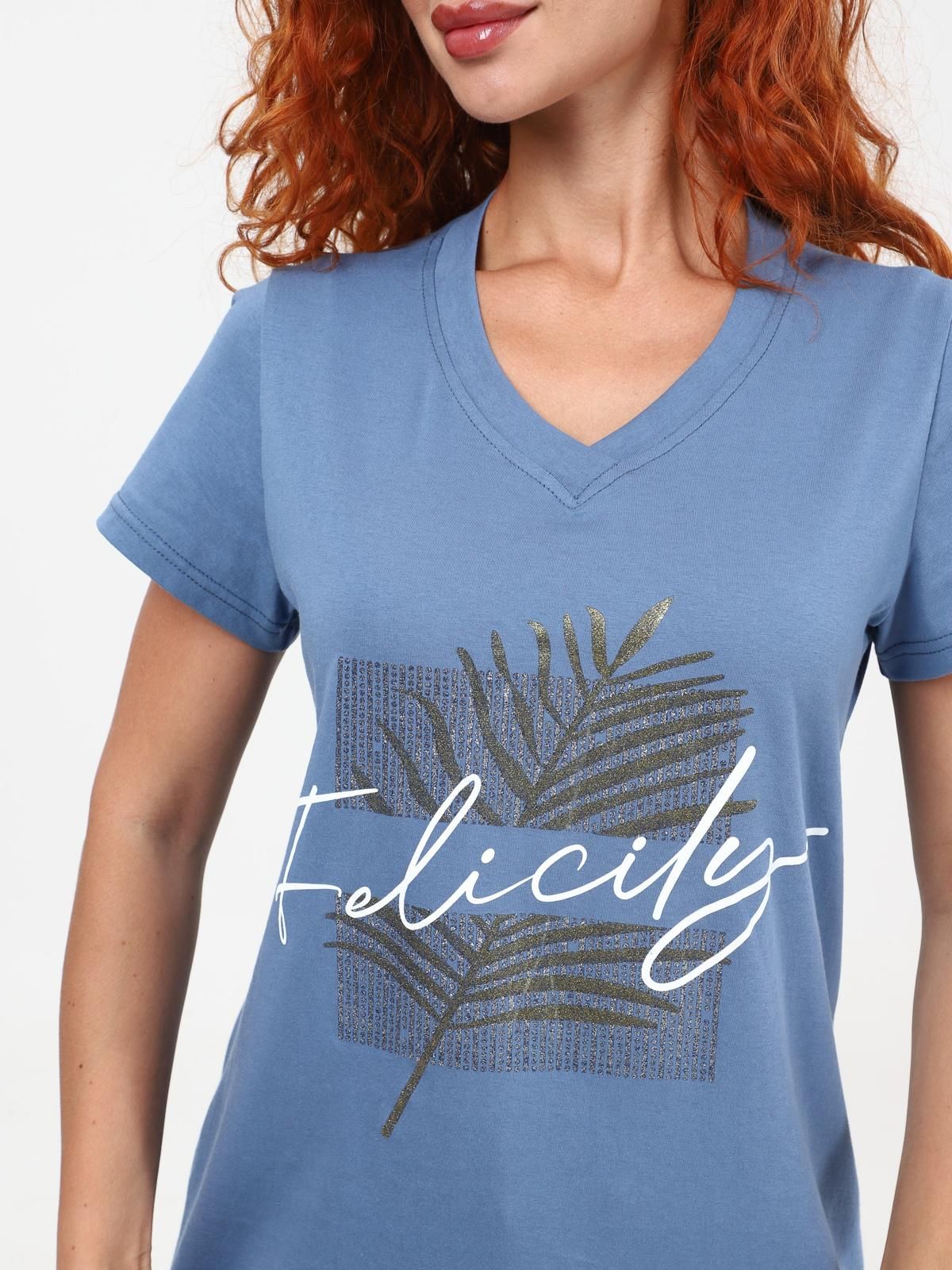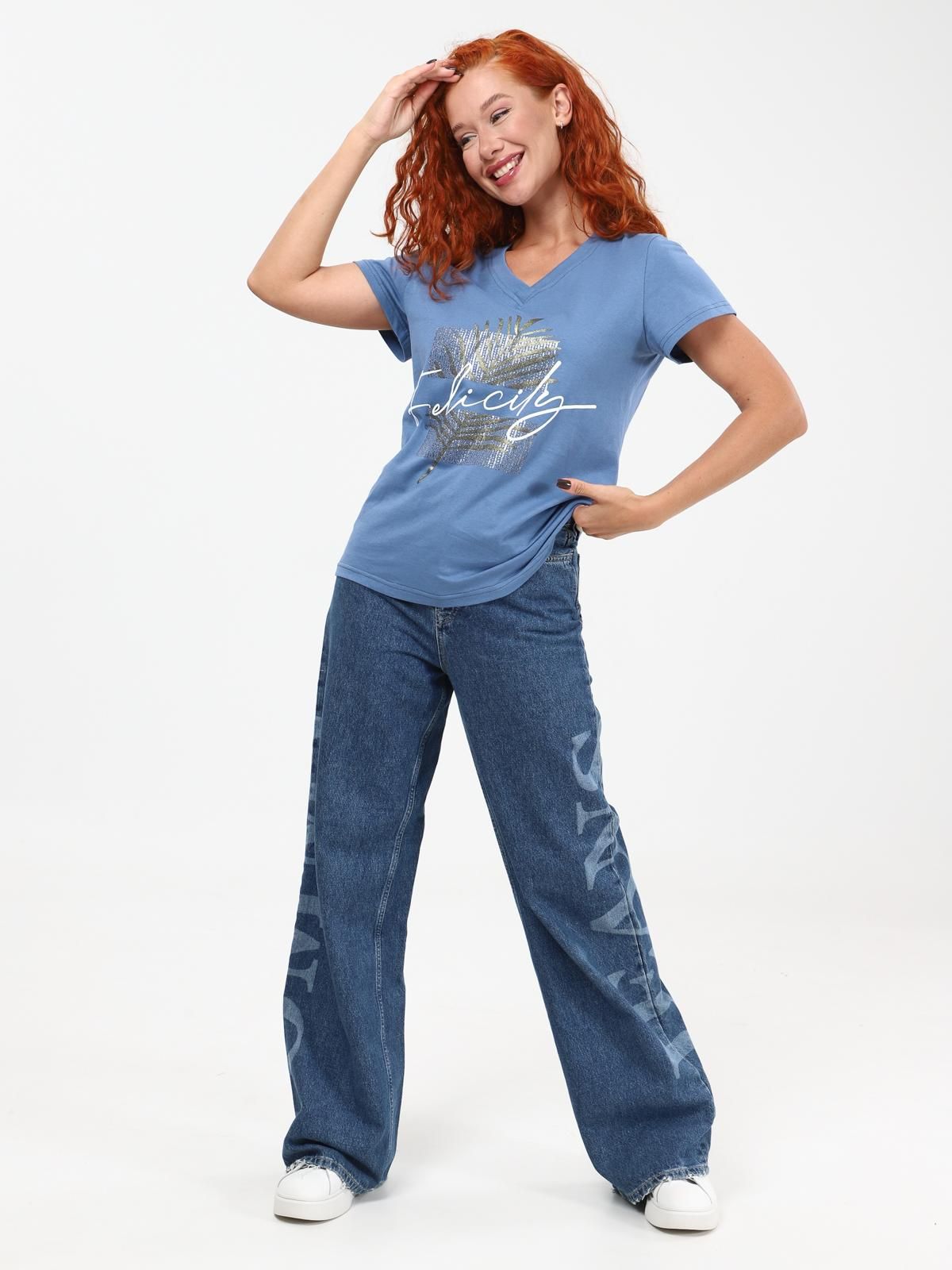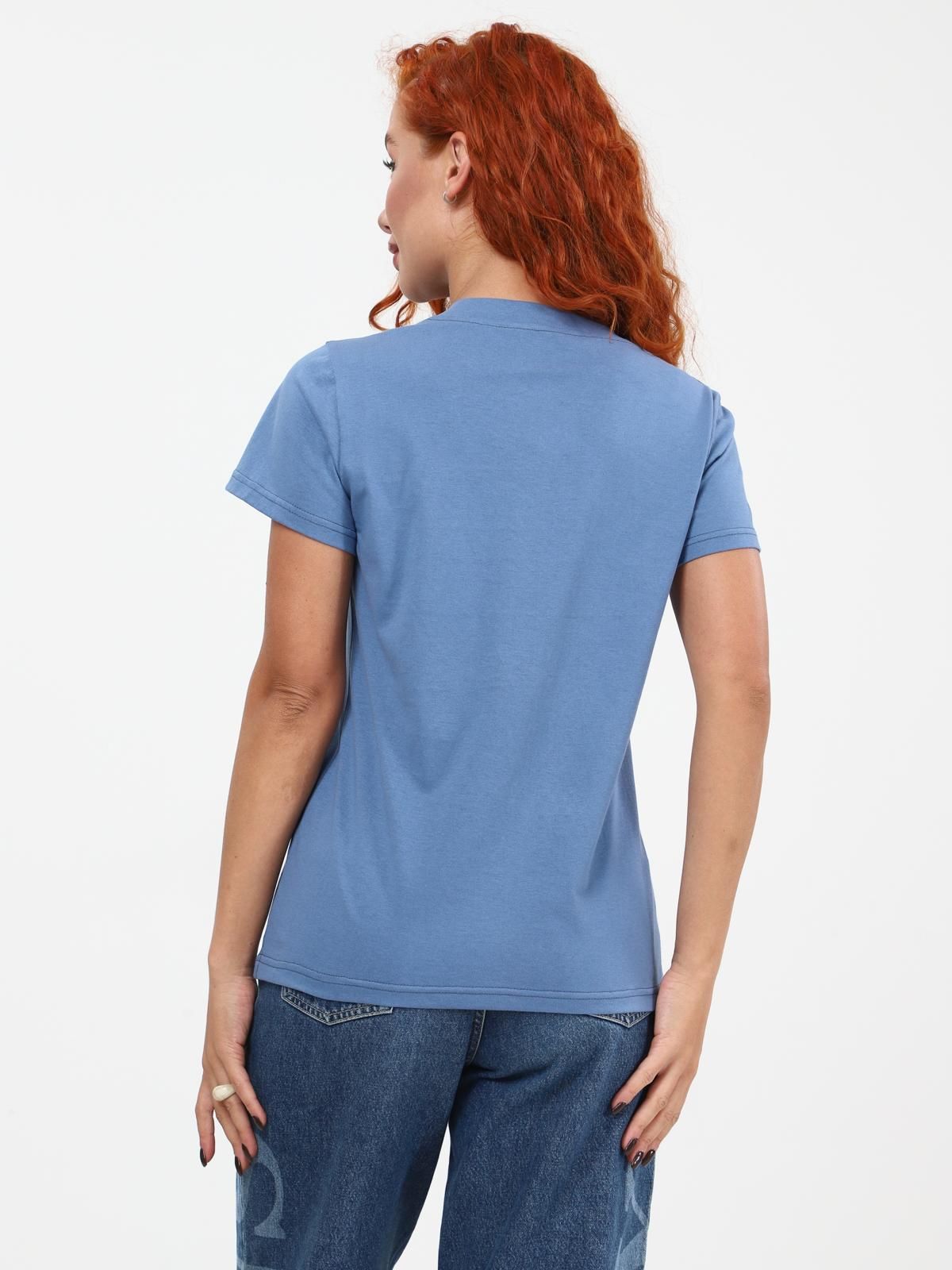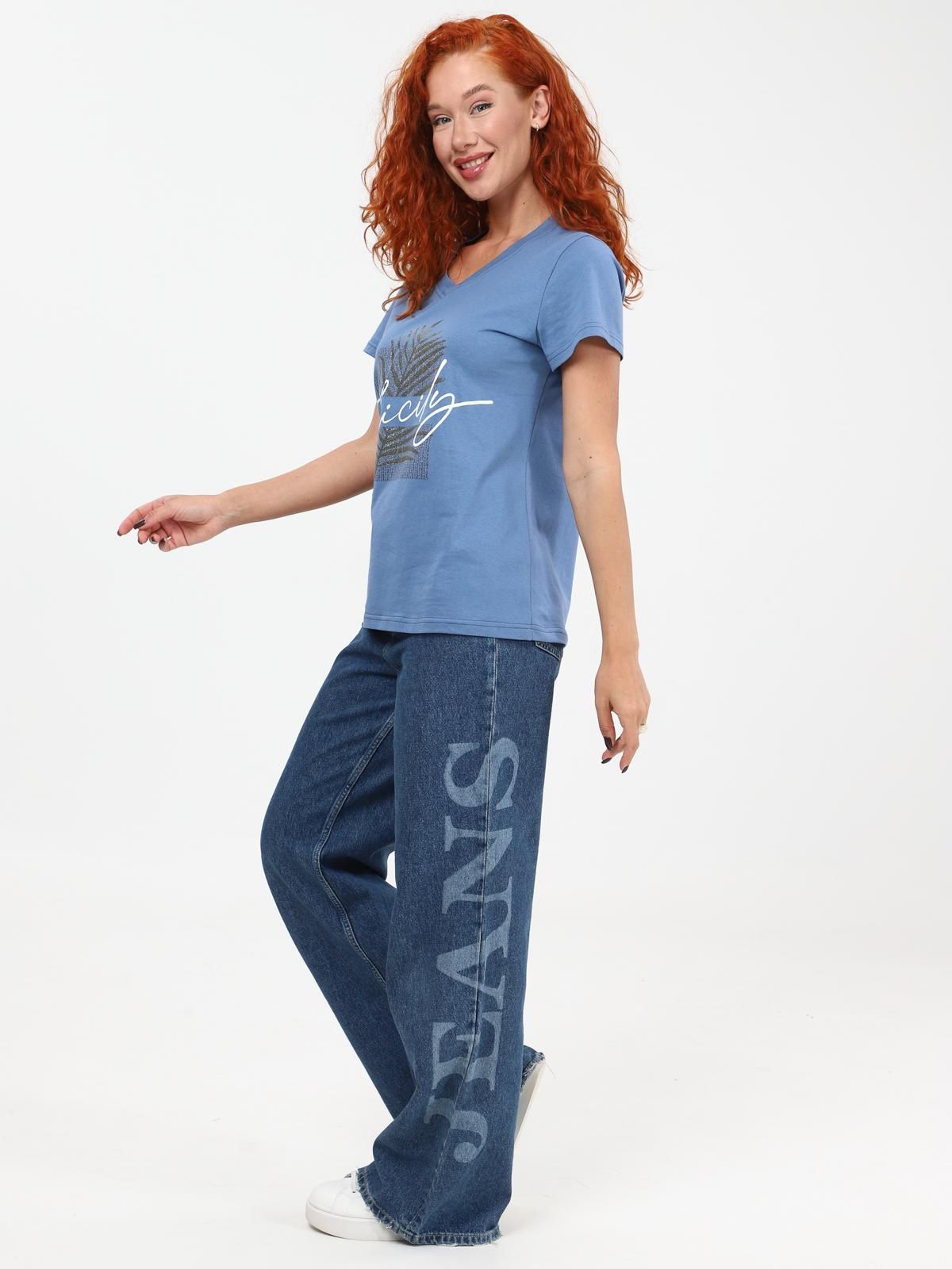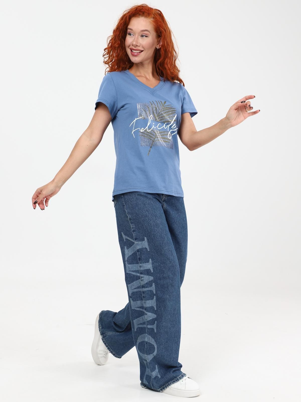 Футболка трикотажная цвета индиго от компании Iv-czpriz. Модель прямого кроя, V-образный вырез горловины. Втачные короткие рукава. Стильный вариант на каждый день.